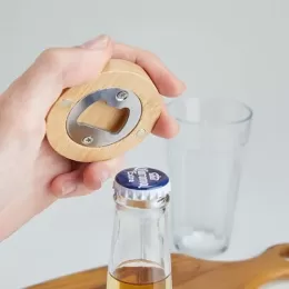 Descrição: Abridor de garrafa em metal com acabamento em bambu e imã.