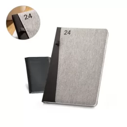 Agenda A5 em rPET. Está organizada num plano diário. Possui suporte para esferográfica (não incluída) e marcador em fita. Fornecida com bolsa de non-woven. 148 x 210 mm | Bolsa: 205 x 250 mm