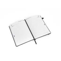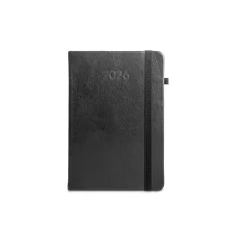 Agenda A5 em PU à base de água. Inclui um suporte para esferográfica (não inclusa), marcador em fita e um elástico para fechamento da agenda. Está organizada em plano diário. 148 x 210 mm