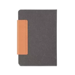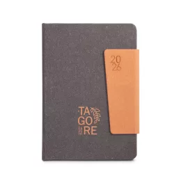 Agenda B5 em pele reciclada (58%) com fecho magnético. Está organizada num plano semanal. Inclui suporte para esferográfica (incluída) e marcador em fita. Fornecida com bolsa de non-woven. 175 x 245 mm | Bolsa: 220 x 270 mm