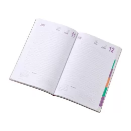 Descrição: Agenda 2026 de couro sintético com abas mensais e marcador de página em cetim. Contém folhas para dados pessoais, calendários 2026 à 2028, planejamento 2026, DDI, página de conversões e páginas de contatos.