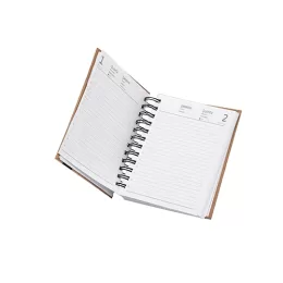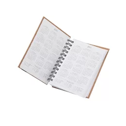 Descrição: Agenda diária 2025 com espiral, material kraft, capa dura. Contém aproximadamente 169 folhas, entre elas, páginas de dados pessoais, calendário 2024 a 2026, planejamento e aniversários do mês.