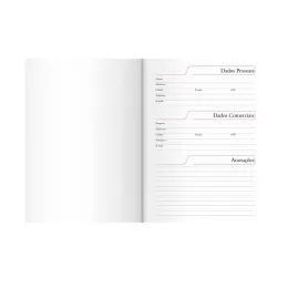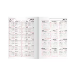 Descrição: Agenda diária 2026 com capa em linho com detalhe em metal, marca-páginas feito em cetim, porta-canetas lateral e fechamento em elástico. Possui páginas para planejamento mensal, calendários de 2026 a 2028, além de listas de conversão de pesos e medidas, contatos e códigos DDI.