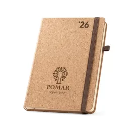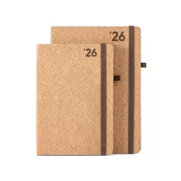 Agenda A5 em cortiça. Agenda com suporte para esferográfica e miolo em cor marfim. Fornecida em bolsa de non-woven. Esferográfica não inclusa. 148 x 210 mm | Bolsa: 205 x 250 mm