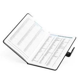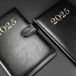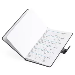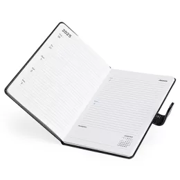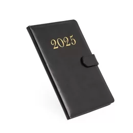 Descrição: Agenda semanal 2025 produzida em couro PU com fecho magnético. Contém folhas para dados pessoais, calendários 2025 à 2027 e planejamento 2025.