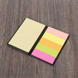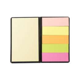 Bloco de anotações couro sintético com post-it, frente e verso liso. Possui cinco blocos coloridos auto-colantes com aproximadamente 25 folhas e bloco amarelo com aproximadamente 30 folhas.
