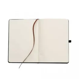 Descrição: Bloco de anotações sem pauta com capa dura, tem aproximadamente 200 folhas amareladas.