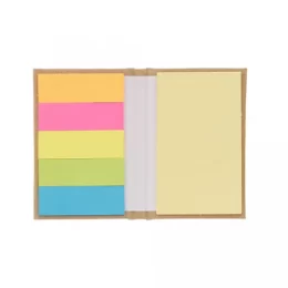 Bloco de anotações com capa dura, sticky notes e miolo sem pauta na cor amarela.