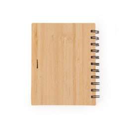 Bloco de Anotações Bambu com Caneta e post-it. Capa de bambu com cinco detalhes circulares vazados referente aos post-it internos, possui uma faixa preta no lado esquerdo da capa e verso liso. Cinco blocos auto-colantes coloridos com aproximadamente 20 folhas cada, bloco amarelo com aproximadamente 20 folhas e 70 folhas aproximadamente brancas pautadas com logo reciclado na lateral inferior. Acompanha suporte elástico de nylon com uma caneta de papelão com acessórios plásticos.
