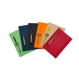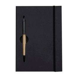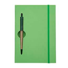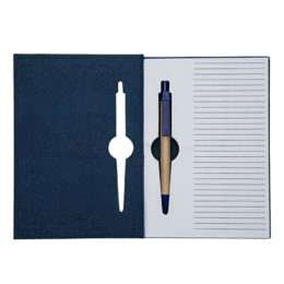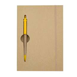 Bloco de anotações ecológico com capa e miolo vazados, utilizados como suporte para a caneta.