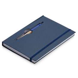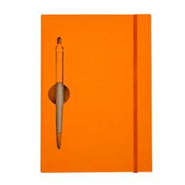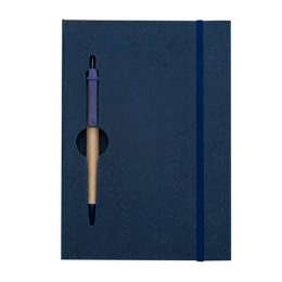 Bloco com miolo de picote, elástico para lacre e caneta de papelão com detalhes plásticos, carga esferográfica na cor azul e acionamento por clique.