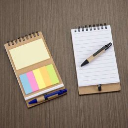 Bloco de anotações ecológico com autoadesivos e mini caneta. Bloco com wire-o e detalhes vazados na capa, contém conjunto de cinco bloquinhos autoadesivos coloridos.
