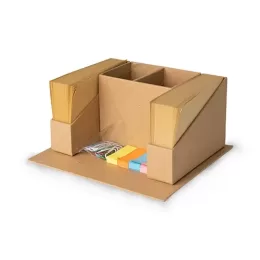 Bloco de anotações ecológico com porta canetas e autoadesivos. Possui dois compartimentos para canetas, réguas e pequenos objetos. Inclui dois blocos de papel kraft com aproximadamente 250 folhas cada, um pacote com cerca de 16 clipes coloridos e quatro blocos de marcadores de páginas coloridos, cada um com aproximadamente 60 folhas.