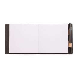 Bloco de Anotações Ecológico com Mini Caneta e Post-It. Possui cinco detalhes circulares vazados na parte inferior, caneta ecológica de papelão com clip e ponteira plástica. Bloco branco sem pauta com aproximadamente 100 folhas e cinco blocos auto colantes coloridos com aproximadamente 20 folhas cada.