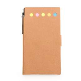 Bloco de Anotações Ecológico com Post-it e Caneta reciclada. Possui uma trava na própria capa, caneta de papelão com acabamentos em plástico acionada por clique, cinco blocos auto colantes coloridos com aproximadamente 20 folhas cada, bloco de post-it amarelo com aproximadamente 20 folhas e bloco com aproximadamente 50 folhas brancas sem pauta.