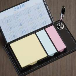 Bloco de anotações em couro sintético e suporte plástico para caneta(não acompanha caneta). Possui costura branca, acompanha calendário no suporte plástico interno e bloco com aproximadamente 120 folhas amarelas, azuis e rosas auto colantes. Acompanha calendário no compartimento plástico interno.