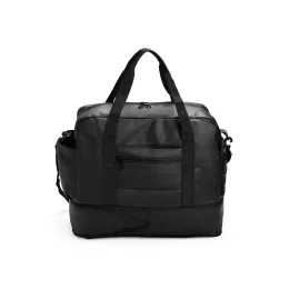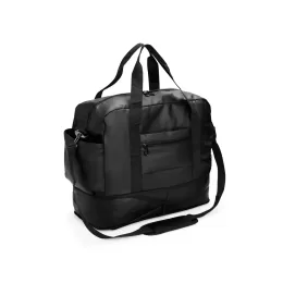 Descrição: Bolsa em filme sintético tipo couro impermeável, com até 30 litros de capacidade após expansão inferior. Possui compartimento interno com bolso menor e outros quatro externos: um com botão magnético, um para calçados, um aberto e outro com zíper e encaixe para malas. Possui um par de alças laterais de mão e uma alça transversal removível.