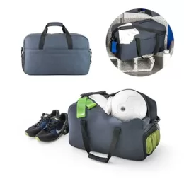 Bolsa esportiva em rPET 600D com interior forrado e fundo com placa semi-rígida. Compartimento principal e bolso frontal com fecho e dois bolsos laterais, um em rede e outro com fecho. A bolsa tem alça de ombro removível e ajustável em webbing com reforço almofadado. 500 x 300 x 230 mm