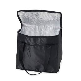Descrição: Bolsa térmica de poliéster com capacidade de 36 litros, contém área interna com revestimento térmico aluminizado, bolso frontal externo e alças de mãos para transporte.