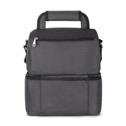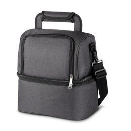 Bolsa térmica em tecido poliéster, bolso frontal, alça de mão, alça de ombro regulável com 2 compartimentos térmicos.