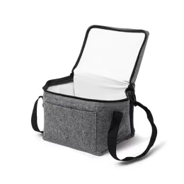 Descrição: Bolsa térmica feita em feltro com capacidade para 5 litros, possui revestimento térmico, bolso frontal e alças para as mãos.