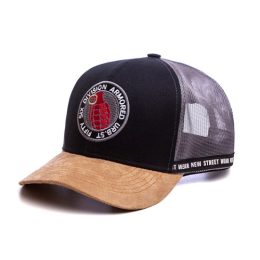 Boné 06 gomos, aba curva, confeccionado em sarja+ tela. Aba em suede, frontal revestida com entretela inteligente, estampa frontal em patch aplicado no bordado, ajustador snapback.