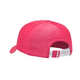 Boné 06 gomos aba curva, confeccionado em tela mesh, frontal revestida com entretela leve, frontal com aplicação em metal, ajustador em fivela de metal niquelada.