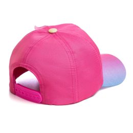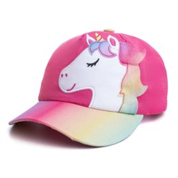 Boné infantil, confeccionado em microfibra com proteção uv, aba em tecido holográfico, regulador plástico, estampa com aplicação de unicórnio interativo, estampado em sublimação, recortado a laser e fixado na peça com bordado.