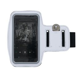 Descrição: Braçadeira de neoprene com detalhe frontal em couro sintético. Visor plástico e contorno prata, possui “bolso” para chave, “cinta” de velcro regulável com posição indicativa na lateral(A e B). Possui contorno azulado no velcro, parte traseira possui 4 áreas vazadas para poder passar o fone de ouvido(também possuem contorno azulado).