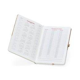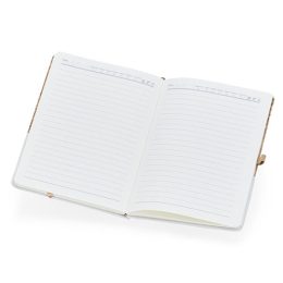 Descrição: Caderneta de cortiça com detalhe em linho e suporte para caneta, contém marcador de página em cetim, página para dados pessoais, calendário 2023 a 2025, páginas de planejamento e aproximadamente 93 folhas marfim com pauta.