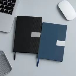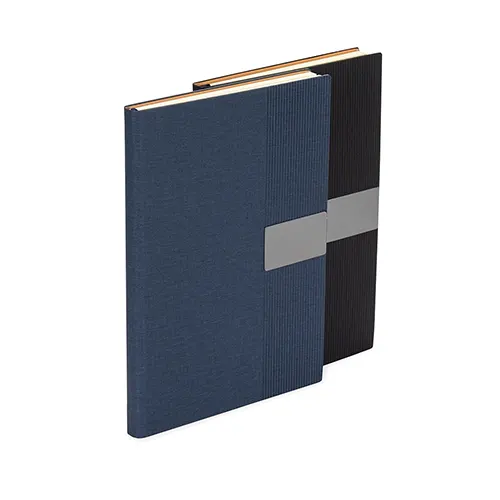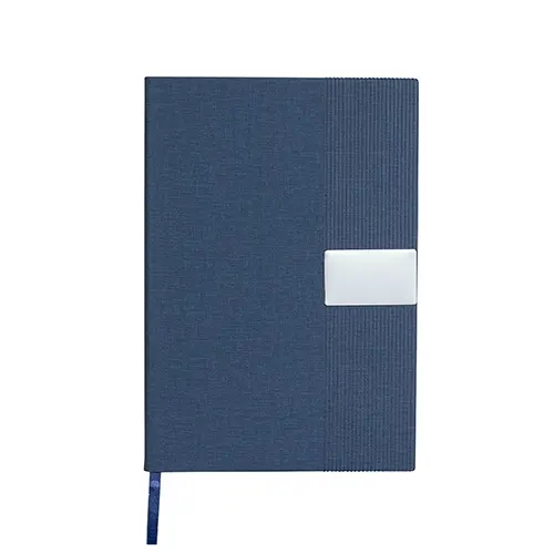 Caderneta de capa em couro sintético com detalhes texturizados, plaquinha metálica personalizável, marca-páginas em fita de cetim e aproximadamente 96 folhas marfim pautadas.