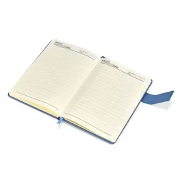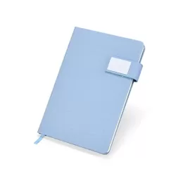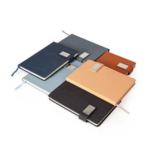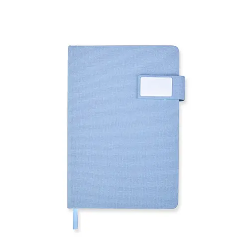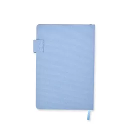 Caderneta capa dura em couro sintético com fecho magnético, placa metálica personalizável, além de marca-página em fita de cetim e aproximadamente 96 folhas brancas pautadas.