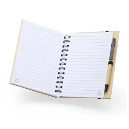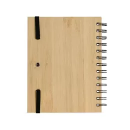 Caderneta ecológica com caneta. Capa de bambu. Possui aproximadamente 70 folhas brancas pautadas com logo reciclado na lateral inferior. Acompanha suporte elástico de nylon com uma caneta de papelão de detalhes plásticos.