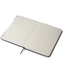 Descrição: Caderneta com capa dura em RPET (PET Reciclado) e inox, com porta caneta e marca página em cetim. Contém aproximadamente 80 folhas com pauta.