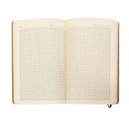 Descrição: Caderneta tipo moleskine com páginas quadriculadas, produzido em material kraft com frente e verso liso e fita elástica para fechar. Contém aproximadamente 80 folhas amareladas quadriculadas.