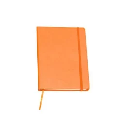 Caderneta tipo moleskine com frente e verso liso texturizado com marcador de página em cetim e elástico para fechar, possui aproximadamente 80 folhas amarelas pautadas.