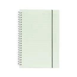 Caderno A5 com capa plástica e elástico para lacre, contém aproximadamente 80 folhas marfim com pauta.