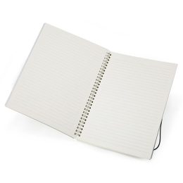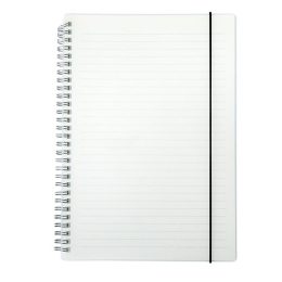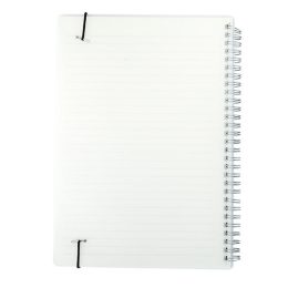 Descrição: Caderno B5 com capa plástica e elástico para lacre, contém aproximadamente 80 folhas marfim com pauta.