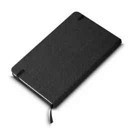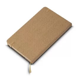 Caderno de anotações, capa em fibra de bambu com elástico e miolo com 80 folhas pautadas na cor bege.