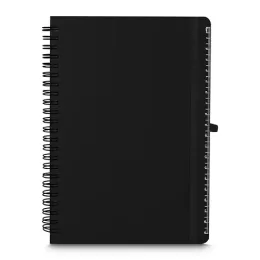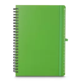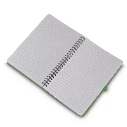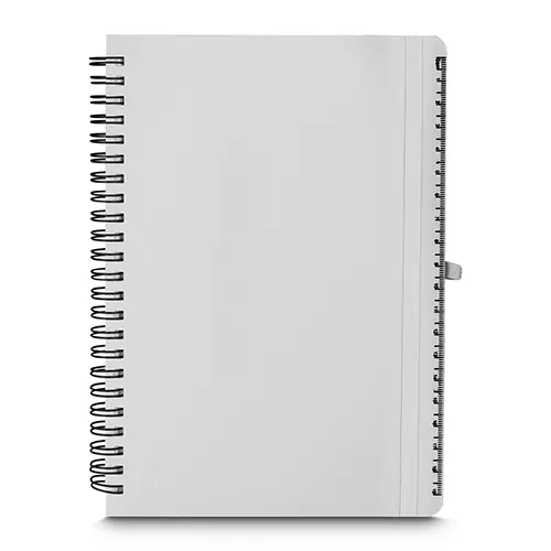 Caderno de anotações em PP(Polipropileno) reciclável com suporte para caneta e miolo de 70 folhas brancas pautadas.