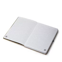 Caderno de anotações com elástico e suporte para caneta, capa dura com 3mm em material reciclável imitando bambu , miolo com 96 folhas pautadas na cor branca. Não acompanha caneta.
