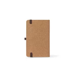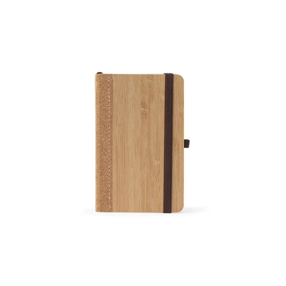 Caderno de bolso de capa dura em folha de bambu e cortiça. Contém 160 páginas, em papel 100% reciclado, pautadas cor de marfim, fita separadora, suporte para esferográfica (não inclusa) e elástico para fecho do caderno. 90 x 142 mm