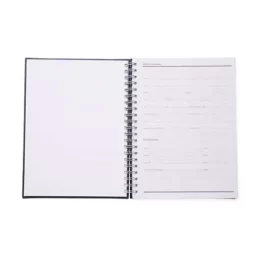 Descrição: Caderno com capa de couro sintético texturizado e espiral prata metálico. Possui aproximadamente 100 folhas brancas pautadas e páginas para: dados pessoais, calendário de 2016 à 2019 e planejamento.