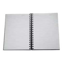 Descrição: Caderno emborrachado de frente e verso lisa com espiral preto. Possui dados pessoais, calendário de 2017 à 2019, aproximadamente 100 folhas brancas pautadas com detalhe “data” na parte superior de cada folha.
