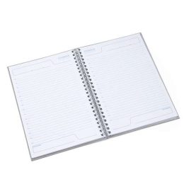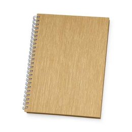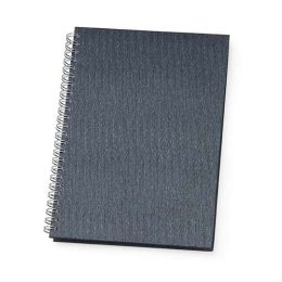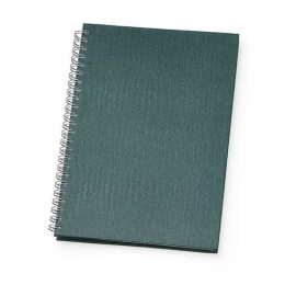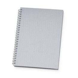 Descrição: Caderno pequeno com frente e verso liso, pintura texturizada e wire-o prata. Possui: folha/envelope plástico, dados pessoais e comerciais. Tem aproximadamente 100 folhas brancas pautadas.