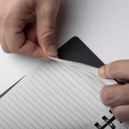 Descrição: Caderno de Anotações em plástico ABS, com wire-o metálico e suporte para caneta. Possui capa e caneta com textura que imitam pedra, suas folhas são impermeáveis e resistentes a rasgos. Contém aproximadamente 70 folhas brancas com pauta e elástico para lacre.