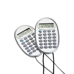 Calculadora plástica oval de 8 dígitos prata com cordão e acessórios coloridos, necessita de 1 bateria AG10 para funcionamento (acompanha).