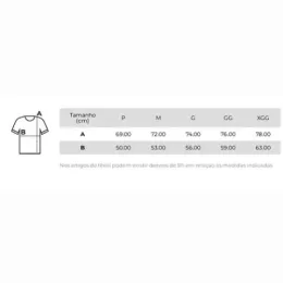 Com gola em ribana 1,5×1,5 com fita de reforço e com costura dupla nas mangas, barra de fundo e laterais. Tamanhos: P, M, G, GG