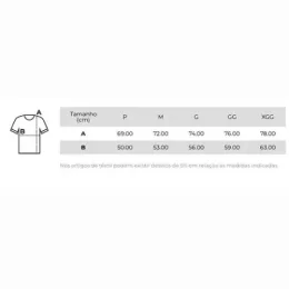Camiseta unissex de corte regular em malha 100% algodão (135 g/m2) com fio 30/1 misto. Com gola em ribana 1,5×1,5 com fita de reforço e com costura dupla nas mangas, barra de fundo e laterais. Tamanhos: P, M, G, GG, XGG