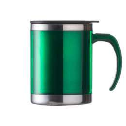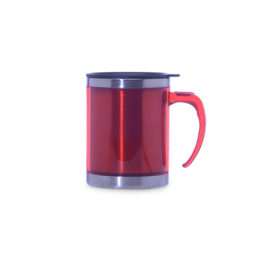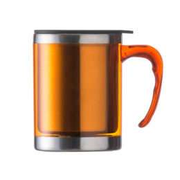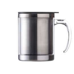Caneca acrílica 400ml com detalhe oval no pegador, revestimento interno e detalhes em inox. Tampa plástica resistente com sistema giratório para abertura(não é térmica).